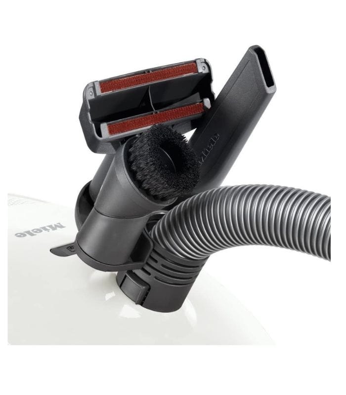 Οι σκούπες δαπέδου Miele συνοδεύονται από τρία κανονικά εξαρτήματα υψηλής ποιότητας: Ένα ακροφύσιο για ταπετσαρίες επίπλων, ένα ρύγχος για πτυχές και γωνίες και μία βούρτσα με μαλακές φυσικές τρίχες. Αυτά ενσωματώνονται και προφυλάσσονται από τη σκόνη ή – αποκλειστικά με τη Miele – σε ένα Vario clip και είναι πάντα εύκολα προσβάσιμα.
