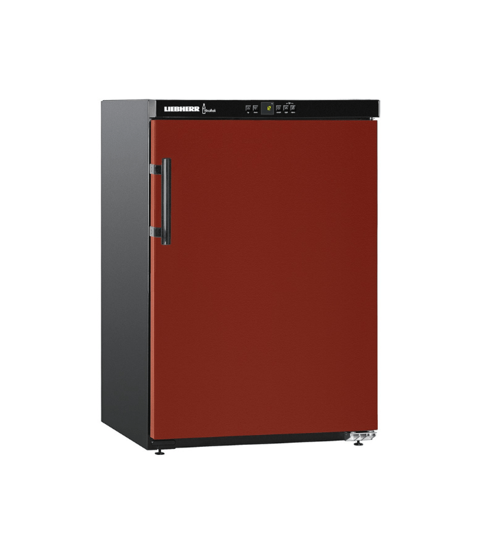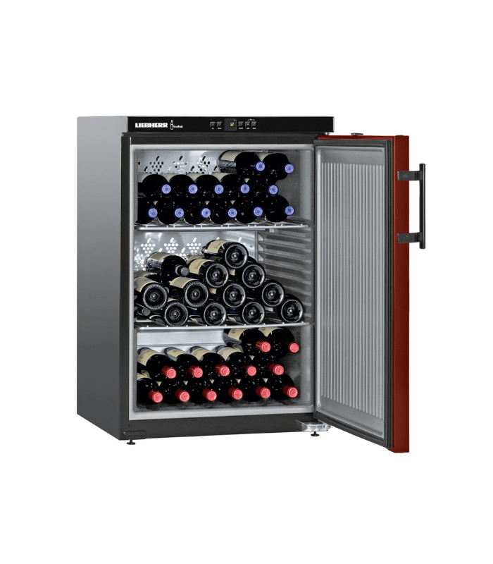 Συντηρητής κρασιών Liebherr σε χρώμα Μαύρο στο σώμα & κόκκινη συμπαγής πόρτα, με ηλεκτρονική ρύθμιση θερμοκρασίας από +50 C έως +200 C, MagicEye, ψηφιακή ένδειξη θερμοκρασιών εξωτερικά, 3 συρμάτινα ράφια ρυθμιζόμενα σε ύψος και χωρητικότητα 66 μπουκάλια.